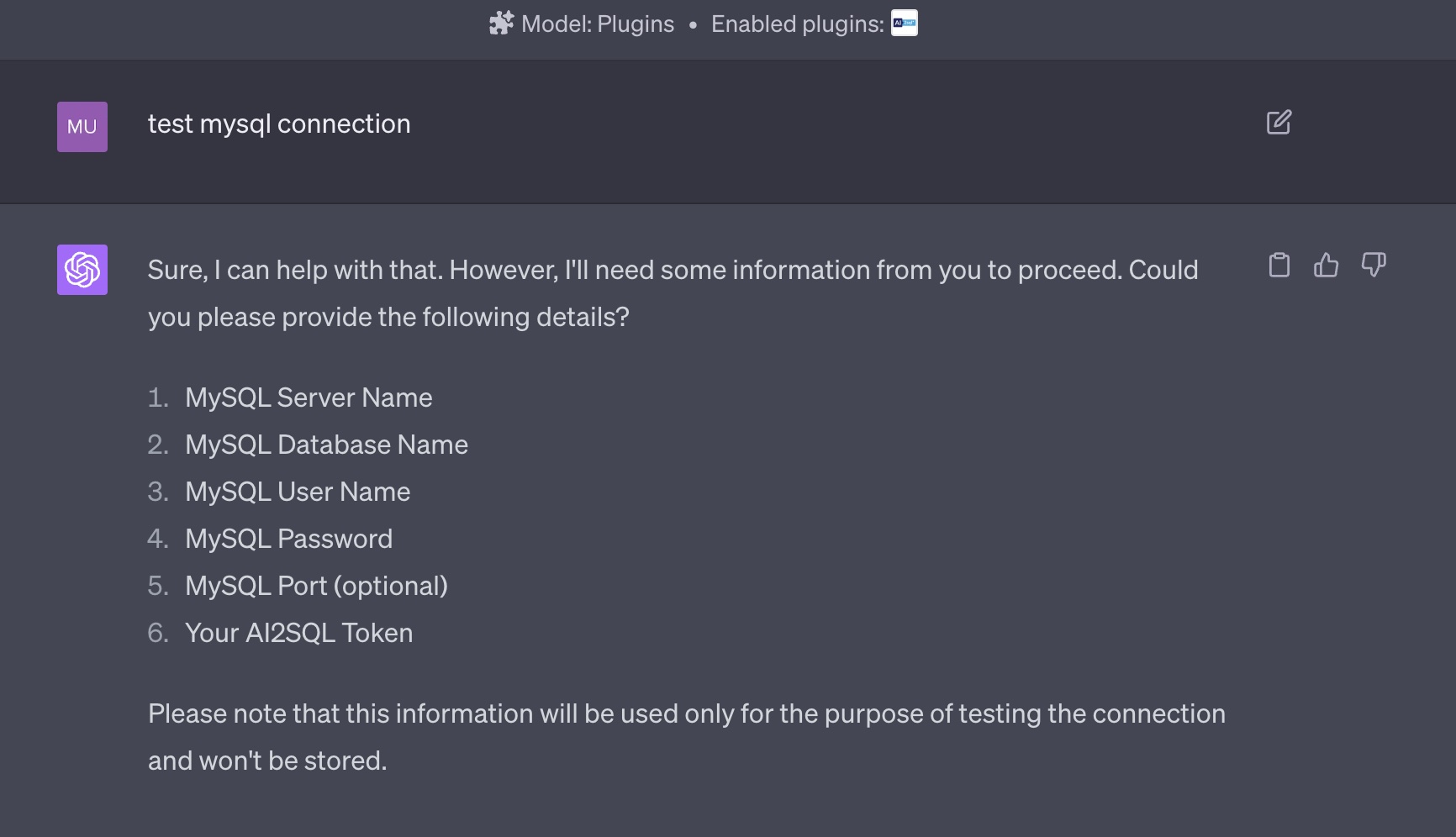 If you encounter any problems during this process, please don't hesitate to contact us for assistance. Do note that certain connection issues might be due to network firewalls or incorrect database credentials. Ensure that your MySQL server is configured to accept connections from the IP address of your ChatGPT application.