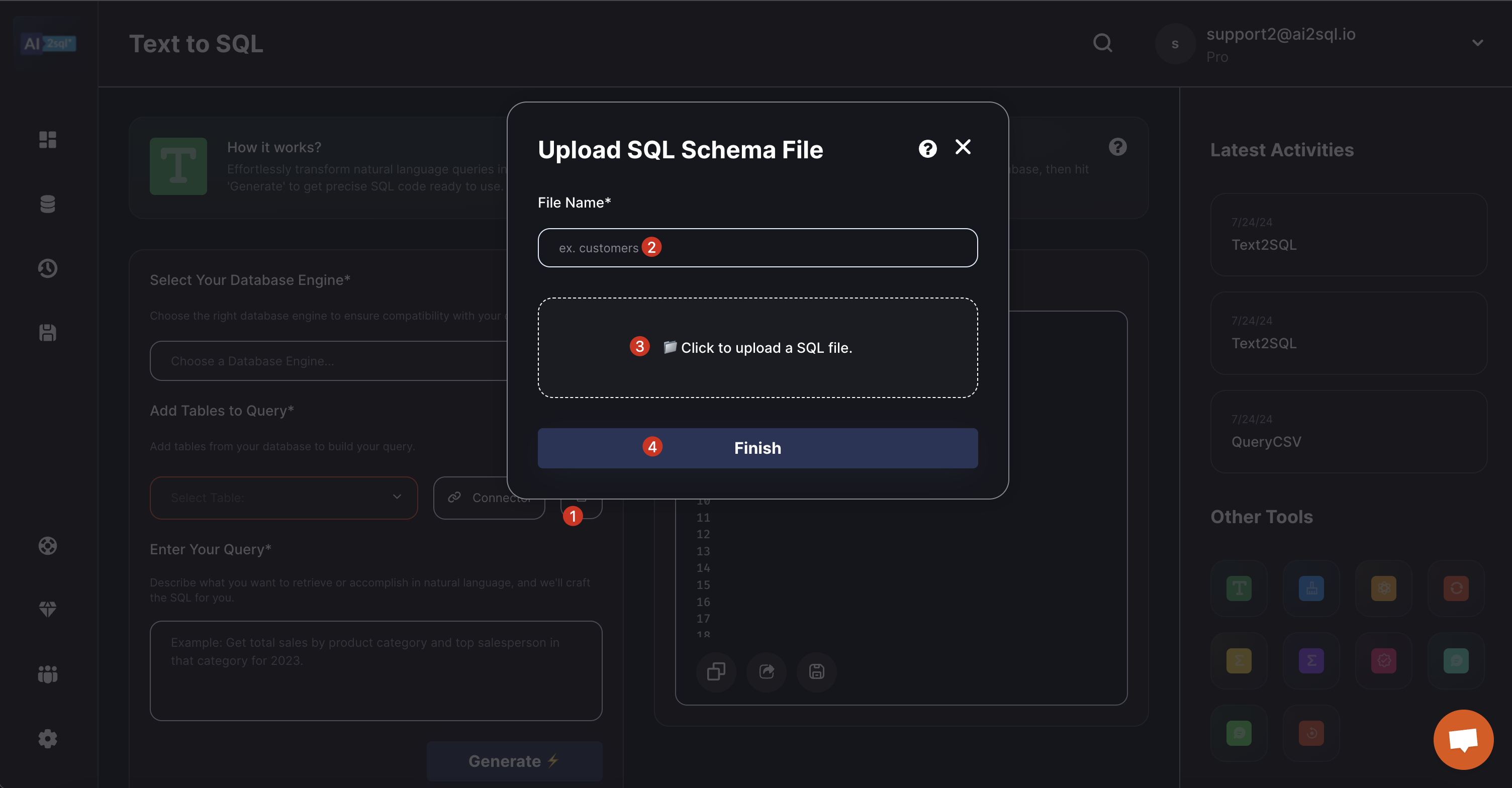 **Important:** When uploading your SQL schema file, please ensure it contains only the structure of your database (tables, columns, relationships, etc.) and not any actual data. The tool is designed to work with database schemas, not with the data itself. This approach helps maintain data privacy and security.